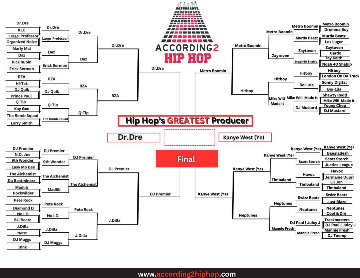 Our Hip Hop’s Greatest Producer tournament highlighting 64 of the culture’s greatest musical masterminds has come down to the Final 2! Will it be the man regarded as the greatest producer in Hip Hop history Dr.Dre or the producer who ushered in a new era in the 2000’s and still going today, Ye (formerly known as Kanye West)? Voting will end this week, and the people will decide who is the Master of the Board.